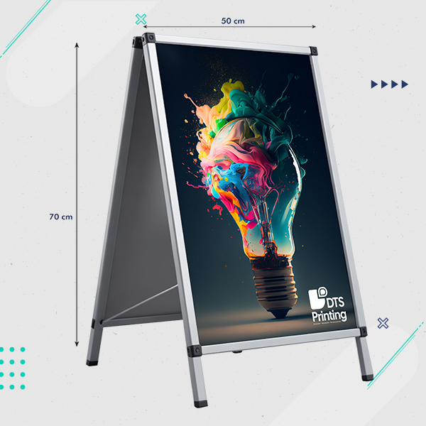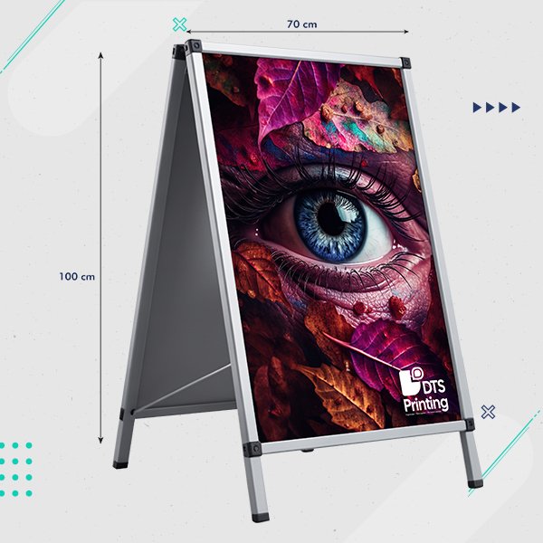 Caballete expositor de aluminio con gráficos intercambiables, ideal para destacar promociones con una imagen siempre actualizada. Resistente, ligero y apto para uso en interiores y exteriores, garantiza máxima visibilidad en cualquier entorno.